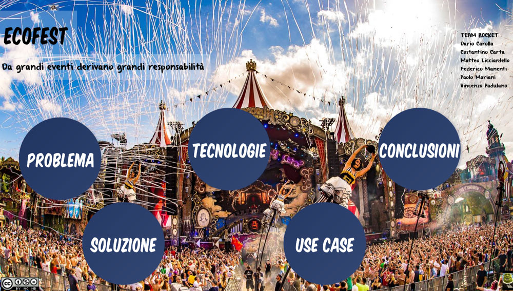 “La nostra idea, che abbiamo denominato “EcoFest”, nasce con lo scopo di rendere i grandi eventi, come i festival, più ecologici. A tale scopo abbiamo pensato di utilizzare tecnologie esistenti e a basso costo per rendere più smart due tipologie di oggetti con cui gli utenti vengono a contatto nel corso dell'evento. La prima è un braccialetto che spesso viene distribuito all’ingresso degli eventi, che grazie a bluetooth o NFC può scambiare informazioni sugli acquisti di prodotti (es. cibo e bevande) con un'applicazione per smartphone.
